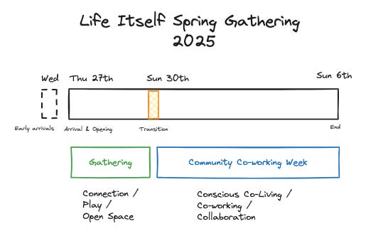 🥳 What: Life Itself Spring Gathering 2025. A weekend gathering followed by a Community Co-working week. You can come just for the weekend or stay for the whole time.