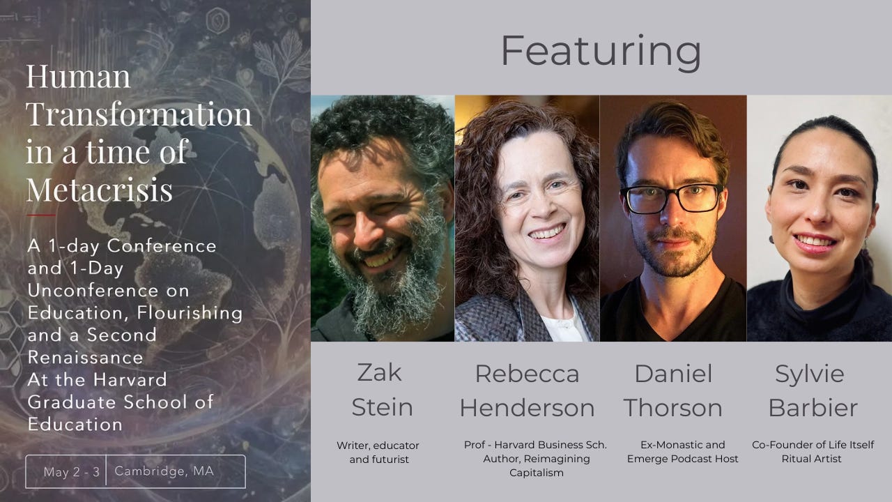 Join Zak Stein, Rebecca Henderson, Sylvie Barbier, Daniel Thorson and Bonnitta Roy—key thinkers across the metacrisis, Second Renaissance, integral, and liminal web scenes—for a two-day gathering on education, human development, and systems change.